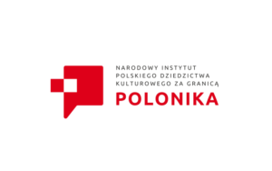 Sygnet w kształcie nieregularnego wielokąta w kolorach czerwonym i białym oraz tekst w kolorach szarym i czerwonym z nazwą Narodowy Instytut Polskiego Dziedzictwa Kulturowego za Granicą Polonika