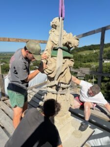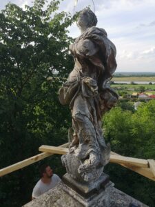 W I etapie – i związanym z nim realizacją programu w 2022 r. najpoważniejszym do rozwiązania problemem było odchylenie kolumny od pionu, spękania trzonu i podstawy rzeźby, złapanych ściągami stalowymi oraz usunięcie wtórnego betonowego cokołu, pod którym ukryte są oryginalne kamienne stopnie. Destrukcja wapiennej skały w przypadku figury i dekoracyjnych elementów architektonicznych, była bardzo zaawansowana – występowało osypywanie się i kruszenie wapienia, spękania. Cały obiekt pokryty był wtórnymi przemalowaniami i cementami. Ze względu na przechył całego obiektu I etap prac zakładał demontaż kolumny wraz z wapiennymi stopniami, odkucie wtórnego betonowego cokołu, oczyszczenie wszystkich powierzchni kamiennych w celu rozpoznania zakresu zniszczeń i zakresu wtórnych uzupełnień oraz zacierek cementowych, wzmacnianie oraz iniekcje spękań. Głównym celem całego zadania było przywrócenie barokowej kolumnie jej wartości artystycznych, historycznych i estetycznych.