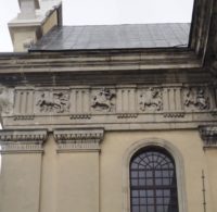 Prace prowadzone były na zewnątrz kościoła przy kamiennym, unikalnym w skali światowej fryzie zbudowanym z tryglifów i metop. Narożniki fryzu zdobione są polskimi orłami, zaś w metopach widnieją płaskorzeźby prezentujące pochwałę oręża polskiego i waleczność rodaków.