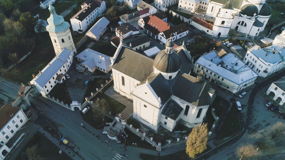 Widok na Kolegiatę św. Wawrzyńca w Żółkwi. Kadr z Filmu o Kolegiacie aut. Artura Jaworskiego.