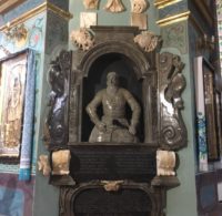 Wewnątrz świątyni, na południowo-zachodnim filarze jej centralnej części, znajduje się wykonany z marmuru i alabastru nagrobek Adama Kisiela. Półpostaciowa figura fundatora cerkwi ustawiona jest we wnęce arkady otoczonej marmurowym obramieniem. U dołu umieszczono tablice inskrypcyjne, całość wieńczy zaś herb rodu Światołdycz-Kisiel. Zmarły został przedstawiony w zbroi, pierwotnie postać dzierżyła w lewej dłoni buzdygan.