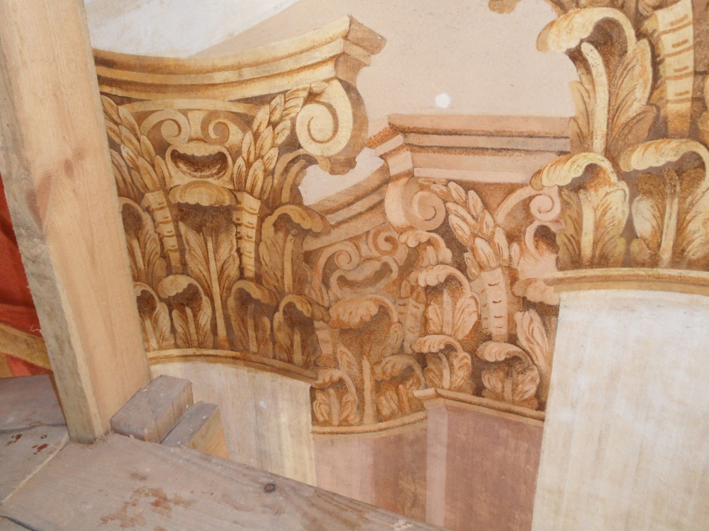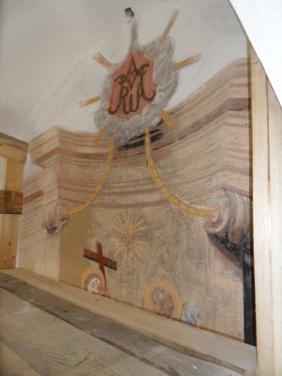 In 2014, the wall paintings inside the church were subject to a comprehensive survey. The illusionist works of art decorating the chancel were partially examined. There were also test cuts made in selected parts of the entire building. The findings of the performed comparative analysis led to a reasonable and much justified assumption that the author of the painting accompanying the altar, stretching across 65 sq m, was Filippo Castaldi, a painter affiliated with the Plater family, author of e.g. the frescos found in the Church of St Louis in Krāslava. Establishing the authorship of the paintings was merely the first stage of the Foundation’s activities undertaken in Piedruja. The plan for the following year was to subject these historic works of art to comprehensive conservation.