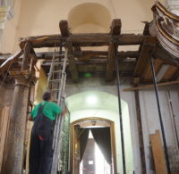 – prace zabezpieczające tynki i polichromie na sklepieniu prawej nawy,