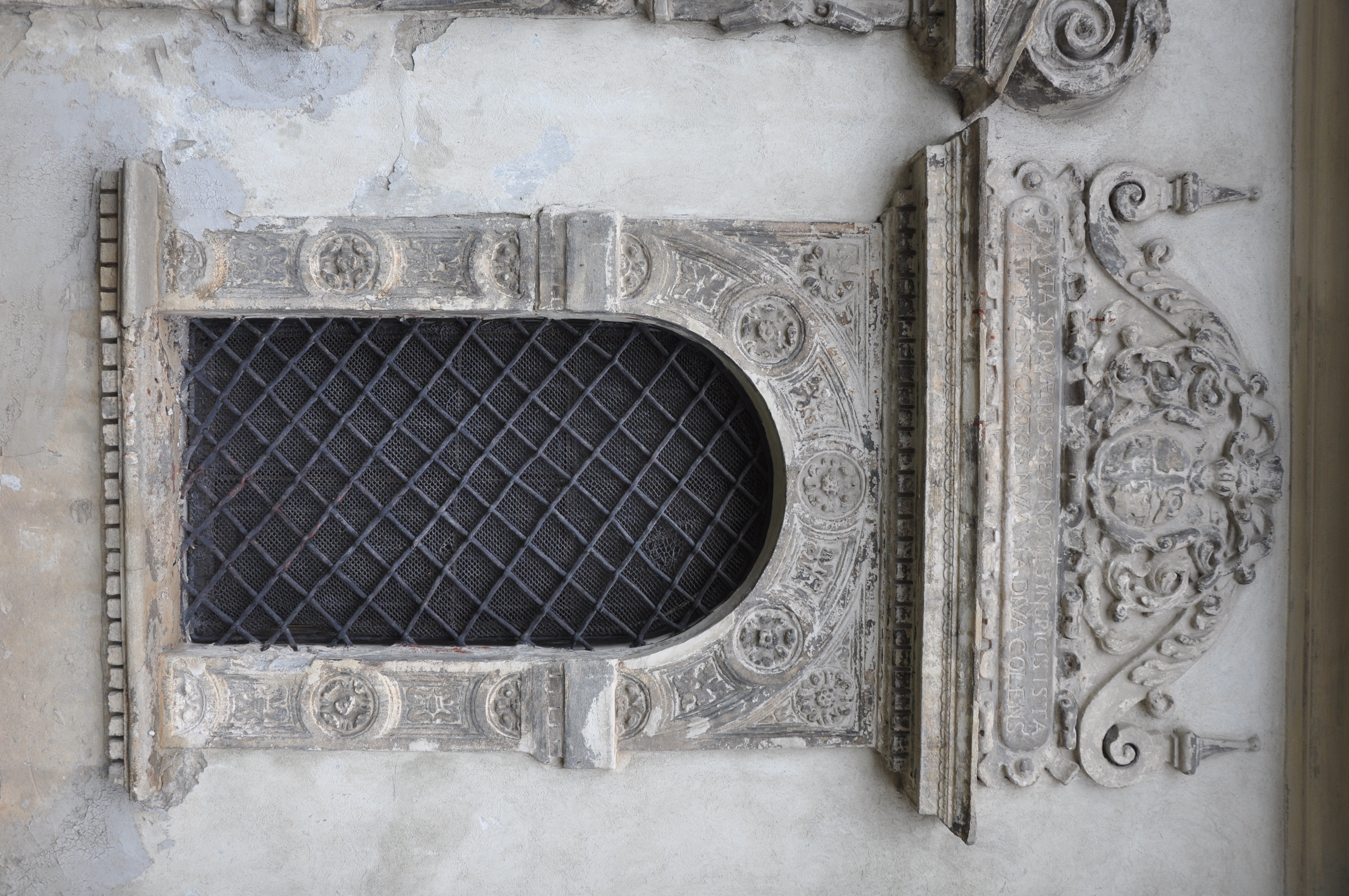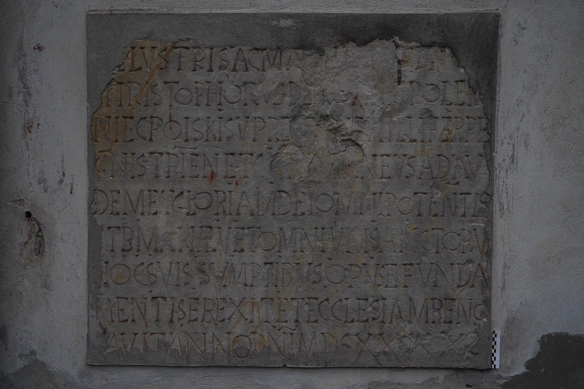 wielkiego koronnego Stanisława Koniecpolskiego) starostę stryjskiego (do 1660 r.), który uczestniczył w przedsięwzięciu budowlanym przy kościele w 1640 r. Umieszczona na północnej elewacji kościoła. Do pożaru w 1886 r. wmurowana w zach. elewację wieży, nad wejściem głównym. Płyta piaskowcowa o kształcie prostokąta, osadzona na czterech kotwach, wmurowana w ścianę. Napis w języku łacińskim, zakomponowany na całej powierzchni płyty. Posiada dziewięć wersów zapisanych majuskułą. Inskrypcja kuta wgłębnie wykonana pismem prostym, przypominającym rzymską kapitałę.