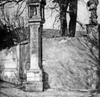 Budowla miała formę czworobocznego słupa zwieńczonego prostopadłościenną kapliczką z przedstawieniami męki pańskiej oraz mnicha z krzyżem. Całość zwieńczona była czterospadowym dachem ze sterczyną, na której szczycie został umieszczony krzyż – to od niego swą nazwę wzięła zaczynająca się u stóp kapliczki ulica Krzyżowa (obecnie Generała Czuprynki). Na wieńczącym budowlę gzymsie wyryta została łacińska inskrypcja. Podobnym wierszowanym motywem opatrzono również samą czworoboczną kolumnę kaplicy.