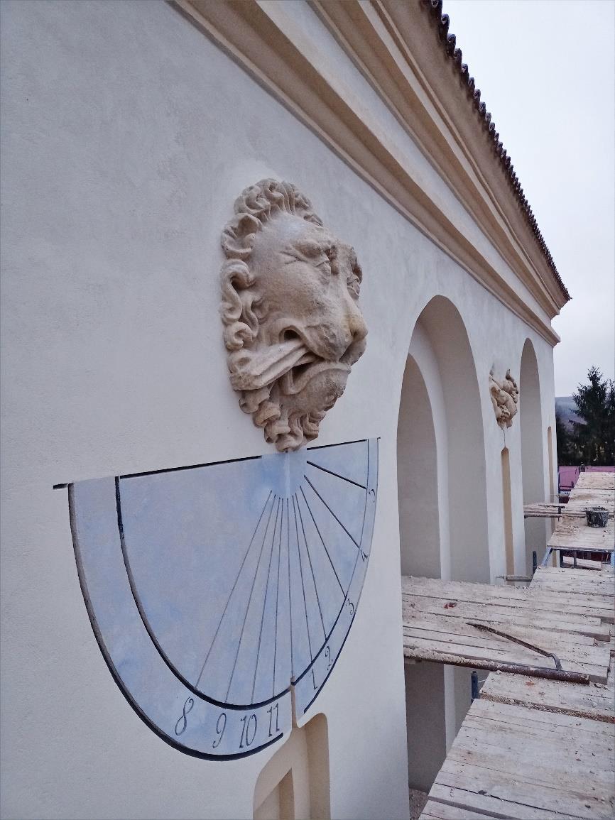 • Wykonanie w alabastrze rekonstrukcji monogramu IHS do tympanonu obramowania okiennego portalu wschodniego (biblioteka);